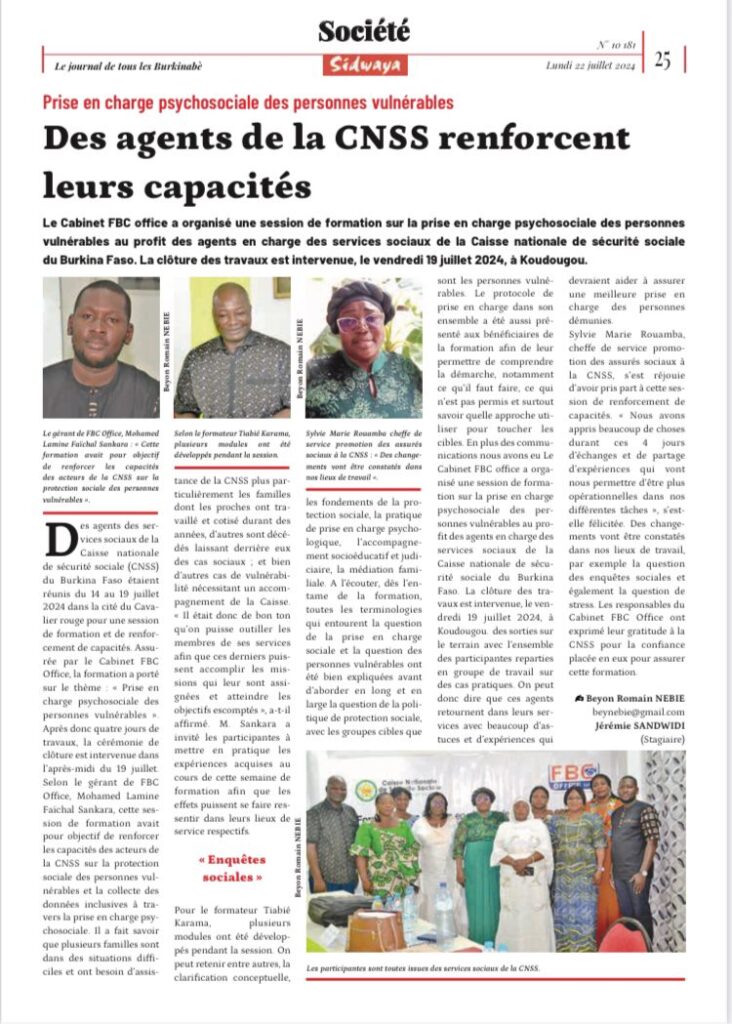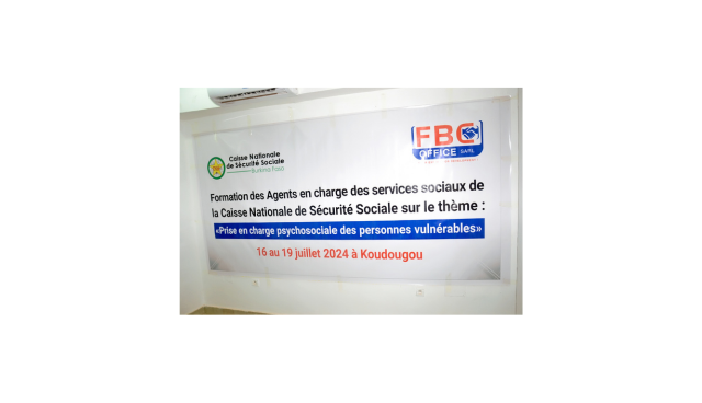 Formation sur le thème : « Prise en charge psychosociale des personnes vulnérables », réalisée à Koudougou au Burkina Faso du 16 au 19 juillet 2024 au profit des Agents en charge des services sociaux de la Caisse Nationale de Sécurité Sociale du Burkina (CNSS).