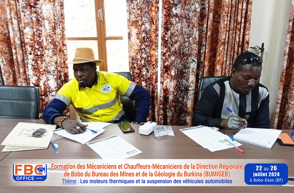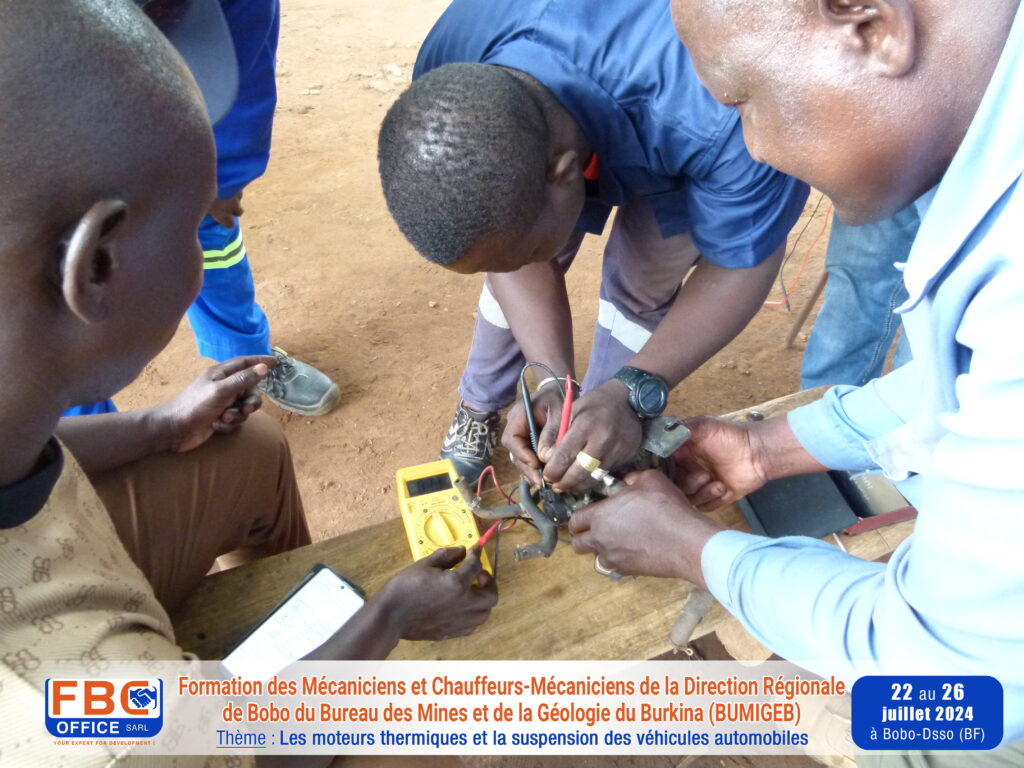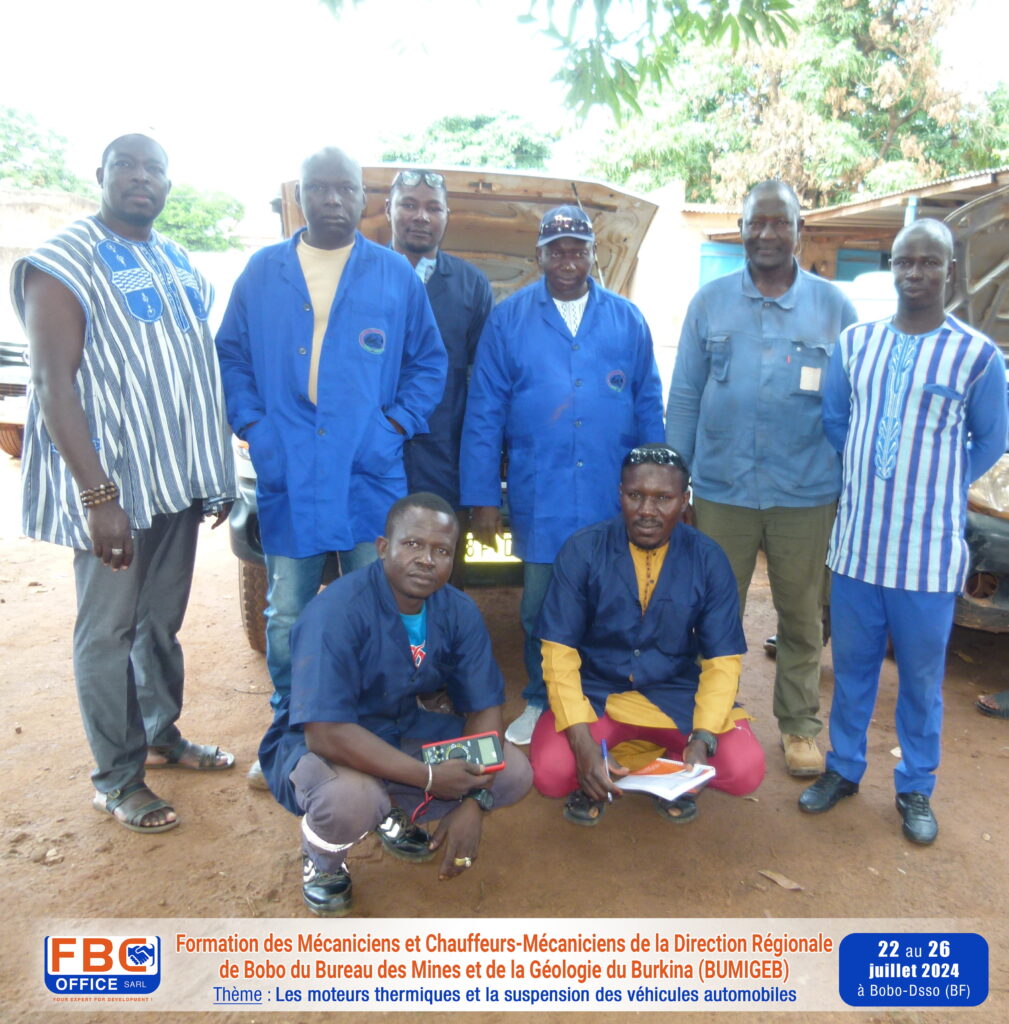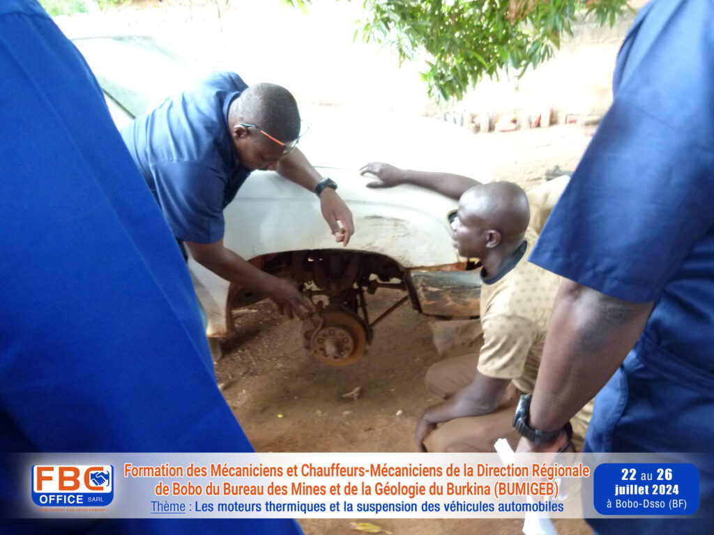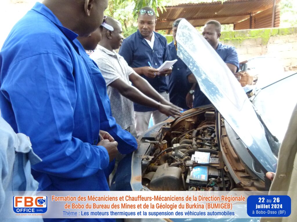 Du 22 au 26 juillet 2024 s’est déroulée à Bobo-Dioulasso au Burkina Faso, la formation sur le thème : « Les moteurs thermiques et la suspension des véhicules automobiles » au profit des Mécaniciens et Chauffeurs-Mécaniciens de la Direction Régionale de l’Ouest du Bureau des Mines et de la Géologie du Burkina (BUMIGEB).