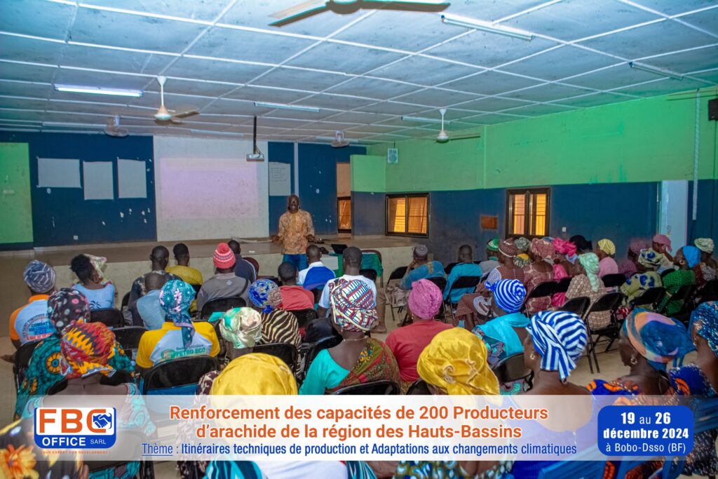 Du 19 au 26 décembre 2024 s’est tenu à Bobo-Dioulasso, un atelier de renforcement des capacités de 200 Producteurs d’arachide de la région des Hauts-Bassins (Burkina Faso) sur le thème : « Itinéraires techniques de production et adaptations aux changements climatiques ».